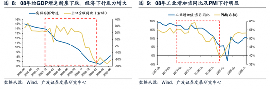 2008年金融危机带来A股风险偏好和基本面的恶化,市场形成悲观预期。2008年年初开始,金融危机持续发酵,全球悲观情绪不断蔓延,A股也进入熊市。进入二季度,中国基本面也出现持续恶化,GDP增速下跌、PMI落至荣枯线以下,出口金额增长率也开始跌至20%敏感线以下,市场情绪更加悲观,A股的熊市呈现进一步加速下跌。有色金属、休闲服务、轻工制造等行业领跌,建筑装饰、公用事业、医药生物等大盘股领涨。
