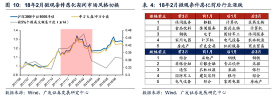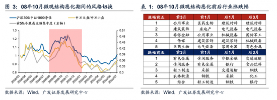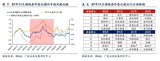 07年末至08年初,DDM核心条件反转+市场微观结构恶化,股市由牛转熊,市场风格切换。在2007年末全球金融危机爆发后,A股DDM模型分子分母端发生反转,导致市场最终发生牛熊切换——分子端,A股非金融盈利增速在08年一季度后转负,二季度后GDP增速、PMI、出口增速断崖式下跌,企业盈利及盈利预期转为悲观;分母端,08年危机前后央行密集加息加准,货币政策趋紧导致市场流动性收缩,同时海外金融危机蔓延激发悲观情绪导致市场风险偏好下行。在DDM三要素均发生逆转叠加市场微观结构恶化背景下,2007年11月后,市场由牛转熊,大小盘相对风格逆转,具有明显大盘风格的银行、非银等行业跌幅居前。