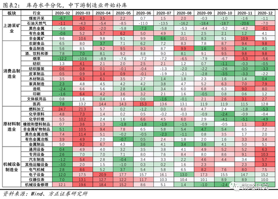 企业加速去库存,部分行业开始率先主动补库。目前来看,2020年12月工业产成品库存增速回升至7.5%,环比10月的全年增速最低点持续上涨,库存周期处于被动去库存尾声,企业或将开启主动补库存周期。从产业链角度看,中游制造业存货增速在3月后快速下降,6月开始小幅补库;上游采矿业自4月份以来开始去库存,进入4季度以来持续加速。从细分行业看,机械设备制造业中,汽车制造、电气机械、电子设备等行业自9月开始进入库存回补阶段;消费品制造业中食品制造、家具制造、造纸等行业自四季度开始进入补库存周期,反映了在国内需求复苏以及海外结构性补库需求增长支撑下,下游制造业率先主动补库存;而原材料制造业以及上游采矿业整体库存增速仍处于底部,其中,石油开采、燃料加工、化纤等行业去库存速度正在加速。