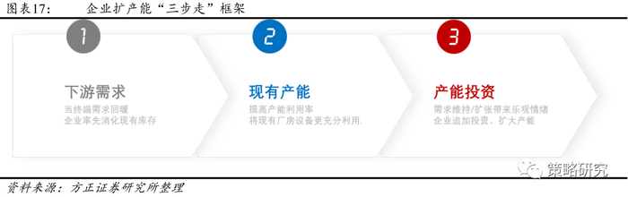 2、企业扩产能的逻辑推演。我们将企业扩产能分为“需求改善→产能利用率提升→产能规模扩大”的“三步走”顺序,其核心是下游需求的改善,前提是现有产能的充分利用。虽然需求改善、产能利用、产能扩张之间存在逻辑上的先后顺序,然而前面两个要素的达成却只是产能扩张的必要不充分条件,需求的持续性是决定企业扩产能的核心因素。当企业盈利改善后,面对未来需求或者经济前景的不确定,其主动扩产能意愿明显不足。所以,短期的需求改善并不足以支撑企业增加产能支出,对经济的乐观预期才是决定企业扩产能的核心因素。