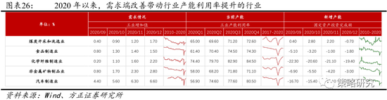 2020年以来,符合需求持续改善,且行业在完成去库存后,需求带动产能利用率明显提升,但企业资本支出并未改善的行业有煤炭开采和洗选业、食品制造业、化学纤维制造业、非金属矿物制品业、以及汽车制造业,主要对应了采掘(二级煤炭开采)、食品饮料、化工(二级石油化工、化学纤维)、建筑材料、汽车等申万行业分类。