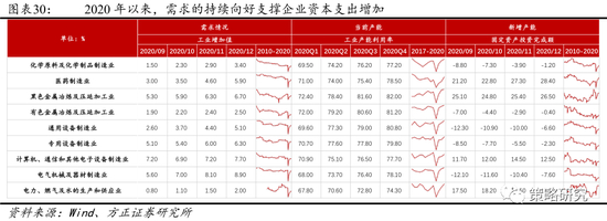 2020年以来,符合需求改善趋势持续,行业高景气以及未来的乐观情绪支撑企业增加资本支出,行业产能开始进入扩张阶段的行业有化学原料及化学制品制造业、医药制造业、黑色金属冶炼及压延加工业、有色金属冶炼及压延加工业、通用设备制造业、专用设备制造业、计算机、通信和其他电子设备制造业、电气机械及器材制造业、电力、燃气及水的生产和供应业,主要对应了化工(二级化学原料、化学制品)、医药生物、钢铁、有色金属、机械设备、计算机、通信、电子、电气设备、公用事业等申万行业分类。