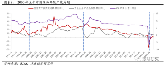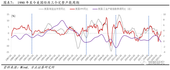 产能周期拐点滞后于库存周期。产能周期主要反映企业在生产设备和基础设施的循环投资活动,是宏观经济运行在微观企业产能周期调整的映射。一方面,企业产能变化反映了对未来经济的预期,另一方面,企业产能投资波动也会加强经济运行趋势,所以产能周期与经济周期存在极大重合。短期工业企业库存的周期性变化是由于供需、需求的阶段性错配导致的产出缺口所致,所以短期库存调整是中期产能调整的过度,一个完整的产能周期必然包含几个库存周期。1990年以来,美国经历了三个完整的产能周期(1992-2004年、2004-2010年、2010-2018年),每个产能周期的高低点都与其周期内某一库存周期的高低点相对应,但会存在1-12个月不等的滞后。美国2010-2018年的产能周期中,美国中周期中第三轮库存周期于2009年8月见底回升,美国新一轮产能周期随后在2010年10月开启;此轮产能周期中嵌套的第一轮库存周期峰值出现在2011年6月,产能周期峰值随后于2012年9月出现。产能周期拐点通常滞后库存周期3-4个季度,所以研究产能周期转换可以通过预判库存周期运行,进而确定产能周期拐点。