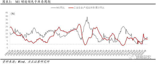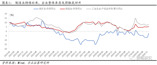 货币流动性向企业流动性传导,企业现金流状况改善支撑补库存动机。M1反映着经济中的现实购买能力,当M1增速回升,则表示消费和终端市场开始复苏,各类市场主体业务活动增强,经济持续修复。从历史数据看,工业企业净现金流与M1具有高度正相关关系,且M1拐点在一定程度上领先企业现金流变化。企业补库存意愿需要现金流的改善作为基础,在前期信贷大规模流向企业后,企业活期存款也在增加。企业账上资金的充裕以及需求端复苏带动企业利润改善,都对企业补库存动机具有明显的正向牵引。M1增速自2020年1月开始快速触底回升,11月一度达到10%增速。根据我们测算,工业企业净现金流增速同样持续快速修复,自2020年2月-19%快速回升至11月-0.3%,负增速在2020年持续收窄。M1增速拐点上行趋势明显,需求复苏带动的主动补库信号增强。