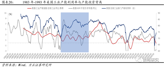 二战后美国制造业经历了60年代的高速扩产能后,在80年代持续低迷。二战后的1960年代,由于科技发展处于低潮,为提振经济,美国实行凯恩斯主义的扩张型财政刺激政策和宽松货币政策,经济持续繁荣,制造业产能迅速扩张。但美国经济长期的结构性问题并未解决,随着财政刺激效力逐步衰竭,美国经济在70年代结束了战后的高速增长,进入艰难的转型期。由于政府不断增加货币供应,叠加第二次石油危机的催化,导致美国在80年初出现高通胀与高失业率并存,1980年4月,美国的CPI同比高达14.8%,1982年11月失业率高达10.8%,需求的萎缩导致生产与投资增速跌至底部。为挽救美国经济,美联储主席沃克尔采用货币紧缩政策迅速将利率提升5%,并随之一路高升。联邦基金利率在1981年高达16.36%,虽然导致经济再次短暂下滑,但社会成本的降低为里根后来推行的经济复兴计划打下基础。1983年经济开始触底回升,需求改善首先带动企业产能利用率的上升,但企业产能扩张意愿被长期压制。1983年至1993年的整整10年中,虽然制造业产能利用率高,但制造业投资持续维持低位,产能始终低速增长。