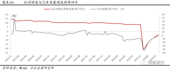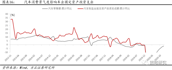 可选消费品需求复苏,汽车等固定资产投资增速或加快寻底。随着宏观经济持续回暖,以及地产竣工峰值带动后市场需求,叠加2020年上半年低基数效应,消费景气复苏逻辑正在得到验证。此外,在“需求侧改革”指引下,提振大宗消费重点消费、促进释放农村消费潜力的政策细则将持续落地,可选消费需求复苏趋势存在较强确定性。在限额以上批发零售商品中,汽车与家电销售额占比约34%,所以可选消费必然成为扩大内需的主要抓手。2020年12月乘用车零售环比增长9.9%,同比增长6.6%,实现了连续6个月约7%的高增长。社会消费品零售增速自2020年2月断崖下跌后,连续10个月快速回升至-3.9%。在制造业投资中,汽车制造与电气机械制造同样占比较高,所以可选消费对制造业投资同样具有较大影响。汽车、家电都属于重资产行业,其产业链包括上游资源品以及中游机械设备,产能的扩张或收缩均具有较大刚性。从历史数据看,车企固定资产投资周期底部与销售周期顶部重叠,所以随着销售数据的持续回升,汽车制造业固定资产投资增速也将加速见底。