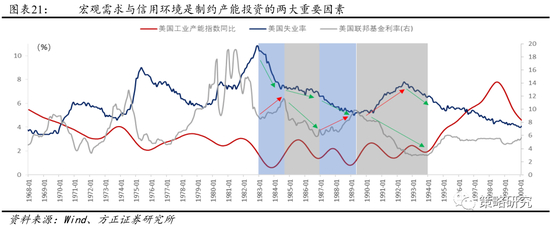 美国生产与投资背离的核心原因是低迷的需求和高企的融资成本。1970至1982年,美国经济处于“滞胀”阶段,前后共经历了4次衰退(分别于1970年、1975年、1980年、1982年),期间出现了美元大幅贬值、通胀率失控、高失业率和低经济增速的并存。随着里根在1981年上台后实施供给侧改革,经济开始转型并最终复苏,但制造业并未同步回暖。我们认为这一时期的生产与投资背离,除了受里根时代供给侧改革政策影响之外,低迷的需求和高企的融资成本交替扰动也是核心因素,1983年至1993年可以被大致分为四个阶段。1983年1月至1984年9月,伴随着失业率的调头下降,市场需求开始回暖,虽然联邦基金利率的快速回升,但工业产能增速在需求支撑下筑底回升。1984年底至1986年底,虽然失业率与联邦基金利率同步持续下行,但CPI在1985年9月再次大幅跳升,导致信用环境收紧预期升温,企业产能投资增速拐点向下。1987年至1989年5月,联邦基金利率如期上行,失业率延续下行趋势,融资成本的持续高企制约了企业投资意愿。1989年6月至1993年底,联邦基金利率持续下行,企业融资环境得到改善,但同期失业率先升后降,中枢有所抬升,需求的不确定较大程度上影响了企业投资信心。通过整个80年代的经济结构调整和供给管理,美国在1994年以后出现了以信息技术和网络技术为先导的新经济,科学技术的发展刺激了潜在需求的释放,伴随着利率水平的长期维持低位,企业投资意愿被真正激发,新一轮大规模的产能周期开始。
