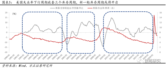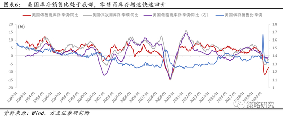 失业率下行周期拐点与第一库存周期起点重合,美国已经具备补库存基础。失业率是朱格拉周期重要划分标志,1993年至今,美国共经历三次失业率下行周期(1993-2000年、2002-2007年、2010-2020年),持续时间5-10年不等。通过历史数据观察,失业率下行周期往往需要经历三个完整库存周期才会结束,且失业率峰值与第一库存周期低点相重合。2020年初的新冠疫情使得美国失业率在4月跃升至14.8%,随后连续8个月下行,美国新一轮失业率下行周期开启,美国制造业存货增速在2020年11月同步回升至-0.64%,连续两个月上行。从产业链角度看,美国零售商、批发商、制造商库存增速分别于6、7月见底,随后共振回升,生产与渠道端的共同补库是经济复苏预期下的乐观信号。与此同时,美国库存销售比持续维持低位,显示了强劲的疫后经济动力,美国补库存具备较强驱动力。