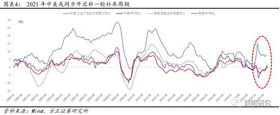 疫后库存水平短暂分化,中美库存周期或将回归共振。从历史数据看,中美库存周期具有较强联动性,其主要原因是中美在全球化产业链分工体系中的不同角色。中国作为“世界工厂”,美国是主要终端消费市场,所以美国需求的变化不仅影响本国产品库存变化,还对中国工业企业的产成品库存水平产生重要影响。2020年一季度,疫情爆发初期,中美库存水平走向分化,中国被动累库,美国持续去库,两国库存水平均快速接近历史极值水平。二季度,随着疫情好转,国内生产牵引需求复苏,美国开启结构性补库,中美库存水平均值回归。2020年下半年,海外需求的持续超预期以及国内疫后经济复苏支持企业开始买进库存,美国库存持续回补。在2021年全球经济有望共振复苏背景下,中美有望同步开启新一轮补库存周期。