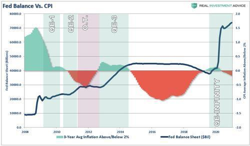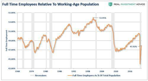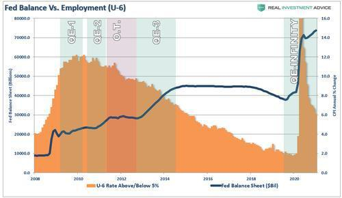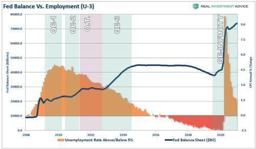 在达到 “充分就业”的目标时,美联储仅在2016年至2018年的短时间内实现了这一目标。在这个关头,美联储确实试图提高利率并减少其资产负债表。不幸的是, 正如我们警告的那样, 结果并不乐观。