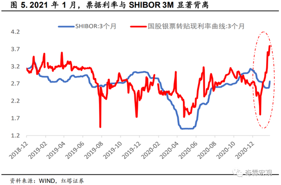 2021年1月,我们注意到1月中旬的时候,银行的负债成本(3M Shibor利率)没怎么动,但票据利率迅速上升,这说明1月的信贷需求很强,银行也有很强的投放意愿。