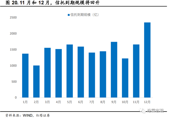 事实上也是如此,11月和12月信托贷款的到期规模会明显上升,11月和12月到期规模分别为1659亿和2346亿。而信托的增量还是受到融资类信托的监管,压降压力很大。