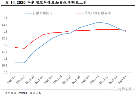 至于说见顶不见顶的标志,指的就是社融存量同比是不是见顶。从数据来看,2020年10月的社融同比高达13.7%,随后就持续下行至2021年1月的13%,社融同比数据确实有见顶的可能性。