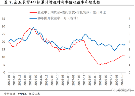从历史数据看,企业中长期贷款+委托贷款+信托贷款的累计同比增速与10年国开债的收益率是正相关关系,而且有一定的领先。所以,企业中长期贷款+委托贷款+信托贷款的累计增速是比较好的判断利率走势的指标,这应该是金融数据分析的核心意义之一。