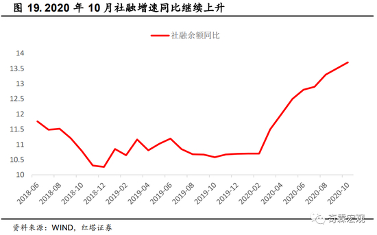 这个时候最好看同比,实际上存量社融同比增长13.7%,再度创下年内新高。因此,2020年10月新增社融的下降主要是季节性因素,还不太要紧,存量的同比增速目前还是稳定的。
