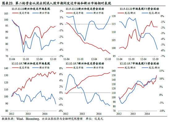 1)2007年至2011年,资金流出股市,次贷危机中发达国家受损最为严重,因此发达市场资金流出更多,相应的,发达市场跑输新兴市场。