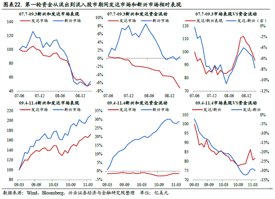 07年7月至09年3月,新兴市场资金先流入后流出,发达市场资金持续流出。次贷危机爆发在发达国家,08年6月蔓延至新兴市场,因此新兴市场“先涨后跌”,资金拐点和表现拐点同步发生在08年6月;发达市场持续下跌,08年四季度后逐渐企稳。相对表现方面,08年6月前,资金流入新兴市场、流出发达市场,新兴市场跑赢;08年6月至08年12月,资金大幅流出新兴市场、小幅流出发达市场,新兴市场补跌;08年12月至09年3月,新兴市场资金企稳、发达市场资金仍在流出,新兴市场震荡,相对跑赢发达市场。