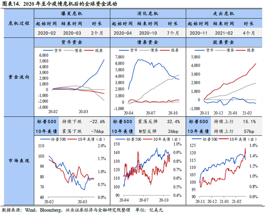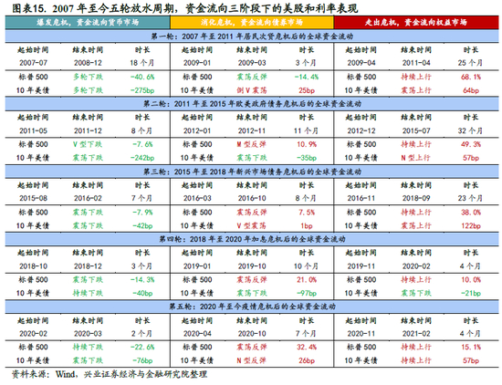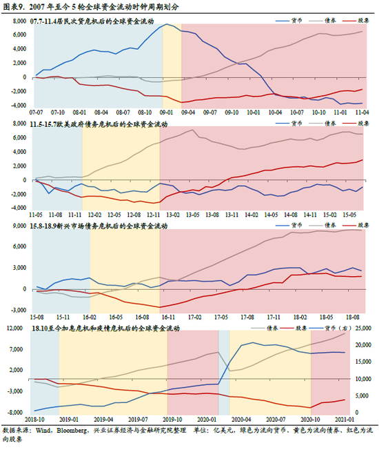 我们回顾2007年至今五轮资产价格周期,均符合全球资金流动时钟:1)债券和股市资金流向货币市场的拐点,股市开启暴跌;2)危机后,资金重新流入债市的拐点,股市震荡反弹;2)危机后,资金重新流入股市的拐点,股市持续上行。