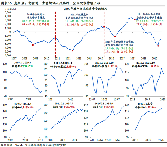 3)危机后,资金进一步重新流入股票时,全球股市持续上涨。