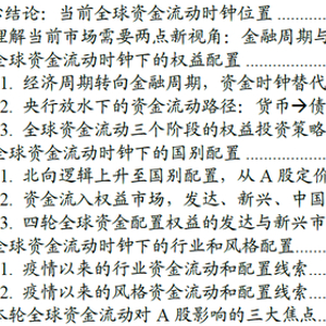 金融周期绑定经济周期、进而逐步主导全球股市的观点,被越来越多的投资者所认可,本文梳理相关逻辑后,重点并不限于此。本文贡献在于提供经历实证检验的全球资金流时钟,以及精炼可靠的六个跟踪指标(货币、债券、股票、新兴发达市场、主要行业、成长价值风格的资金流动规模),抛开纷繁复杂的宏微观指标,直接用于投资决策。其规律可以概括为四点,前三点为权益时钟,第四点为国别时钟、行业时钟、风格时钟: