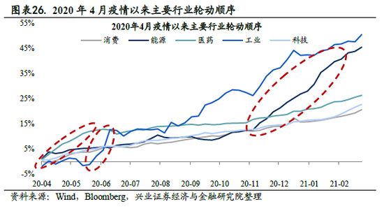 回顾去年疫情后的行业资金流动和相对表现,医药、工业、能源均存在阶段性极为亮眼的表现: