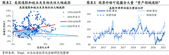 股票逐步跟随金融周期和放水逻辑,愈发类似黄金。2014年以来,标普500和纳斯达克的估值(市净率衡量,剔除盈利影响)扣除黄金涨幅后,呈现较为稳定的均值回归状态,这或许意味着股票价格里的现金流价值没有被大幅错估,而过剩流动性带来的“黄金价值”主导了股票估值变化。2019年至今放水推动黄金上涨近40%,本轮美股估值拉升可能是股票以黄金为锚的“价值回归”。“黄金价值”反映“资产领域通胀”,而“黄金价值”的消失可能对应“泡沫”的消化。