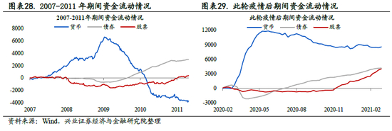 09年4月-11年4月,资金从货币市场流入股市和债市。09年4月开始资金流持续流出货币市场,至10年流出量接近万亿美元;资金流入股债市场,且债券资金流入量高于股票资金流入量。股指和长端美债利率均呈“N”型上升。