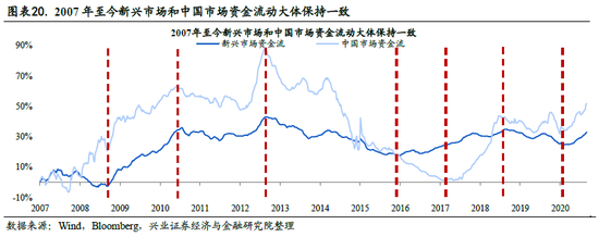 4)本轮疫情全球央行大放水,巨量流动性短期急速拉升发达市场股市,随后开启持续的外溢过程,近月以来资金更多流向新兴市场,中国最为受益,新兴市场也跑赢了发达市场表现。