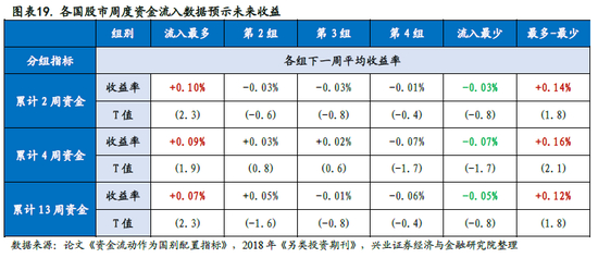全球资金流动数据是国别配置的重要信号。从论文实证经验来看,资金大幅流入的国家,股市在全球资金配置下有望跑赢全球其他国家。以2007-2017年间全球50个国家MSCI指数表现为样本,过去2周、4周、13周累计流入资金最多的国家,在接下来1-11周的表现平均跑赢其他国家,且剔除掉动量相应后依旧显著。