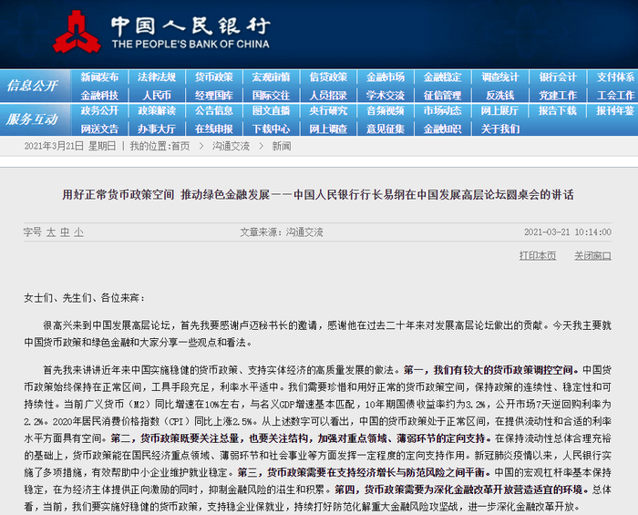3月20日,人民银行行长易纲出席中国发展高层论坛圆桌会,会上,易纲就货币政策操作空间和推动绿色金融发展发表最新看法。