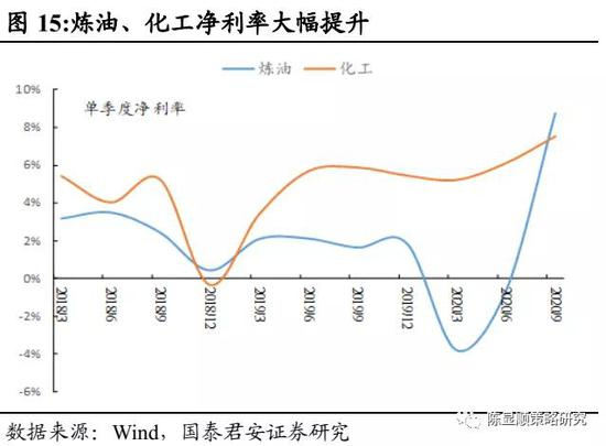 石化化工固投增速超过疫情前水平,炼油、化工盈利大幅改善。受疫情影响,2020年石化化工项目投资启动时间较晚,很多大项目Q3才陆续进入招标和开工,带动固投上行,2020年石化、化工固投增速分别为9.4%和-1.2%,且均在四季度增速提速,12月增速分别达到39.8%和29.1%,超过2019年疫情前水平。根据国君石化团队观点,对炼油企业而言,油价低位启动时期往往炼厂盈利较好,一方面原油及化工品库存随原油价格上涨而产生库存收益,另一方面低位原油价格使得裂解价差处于较高水平。我们对中信石化化工(一级行业)统计发现,20Q1以来炼油、化工企业净利率逐季抬升,20Q3净利率分别为8.8%、7.5%,均已达到2019年以来季度新高。