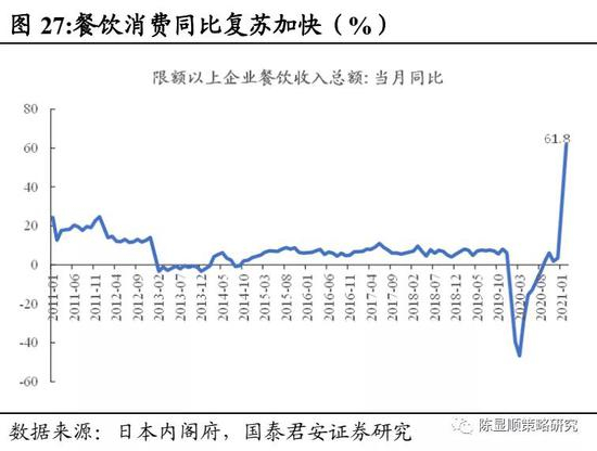 新冠疫情对线下消费构成显著冲击,但疫情得到有效防控后,线下消费需求爆发式反弹。以天津市为例,口腔门、急诊的就诊人数在2020年2月见底后快速反弹,并在2020年8月达到接近历史最高点的水平。餐饮消费收入也有类似表现,2020年3月增速为-46.7%,而后快速反弹,直至2021年2月增速达到61.8%。口腔、餐饮需求的复苏将带动相关领域设备需求提升。
