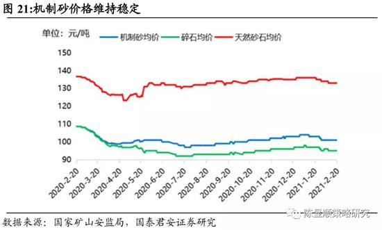 政策支持机制砂发展,推动砂石骨料产业升级。截至2月20日,全国机制砂均价保持在101元/吨,环比持平,据百年建筑网调研,截至2月20日,已开工占比33%,预计在2月26、27日集中开工。2019年以来,政策对于河砂、海砂直接开采管制趋严,支持对砂石矿,特别是非金属矿山尾矿开采,大力发展机制砂。水泥企业进军机制砂市场,推动行业集中度提升。据百年建筑网统计,截至2020年底,国内砂石骨料产能前20合计年产能6.71亿吨,年产能1000万吨以上矿山数量及产能占比仍较低。在政策引领和巨头参与下,对优质资源的收购将成为未来巨头抢夺焦点,行业集中度将持续提升,资本开支将持续上行。