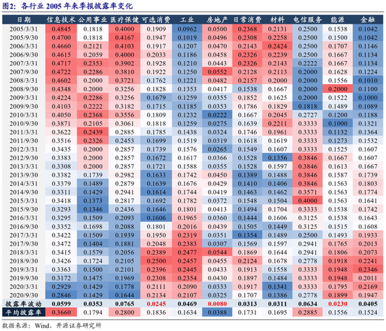 从各个行业2005年以来平均季报披露率的角度来看,以信息技术、医疗保健、电信服务为代表的高新技术板块平均季报披露率相对高于以地产、金融与能源为代表的传统板块。这也符合我们的认知:高新技术行业需要给予投资者更多的企业经营信息作为业绩验证,使投资者对其的成长性定价得以维持。与此相反,地产金融等传统行业被普遍认为业绩缺乏想象空间,投资者对其业绩的关注度相对较低,从而使得公司也相对缺乏主动披露季报的意愿。然而值得注意的是,信息技术与医疗保健行业近些年来大幅扩容,公司家数存量同比增速高于披露季报的公司家数同比增速,使得行业的季报披露率持续下降;而与此相反,金融,工业的行业企业扩容增速平稳,而披露家数增速波动较大,整体上使得行业季报披露率逐步抬升。