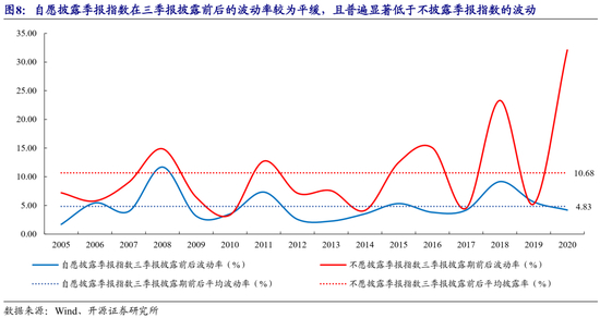 考虑到一季报披露期与年报重合,为剔除年报披露带来的扰动。在分析季报披露期内对两类指数股价波动的影响之时,我们仅考虑自2005年以来的所有三季报披露期前后(9月15日至11月15日)的自愿披露季报指数与不披露季报指数的股价波动率。我们发现,自愿披露季报指数在三季报披露前后的波动率较为平缓,且普遍显著低于不披露季报指数的波动。我们认为背后的原因可能是由于自愿披露季报指数的成分股相对充分的信息披露,使得投资者往往对其业绩存在预期的锚,因此在业绩披露期前后,估值波动会向业绩预期收敛,即博弈的心理相对减退,股价往符合投资者一致预期的业绩增速方向匹配。而投资者在三季报披露期间对不披露季报指数成分股进行定价之时,参考的是同行业中的披露三季报的公司经营信息,因此一致预期的合力相对较弱,股价波动也相对较大。