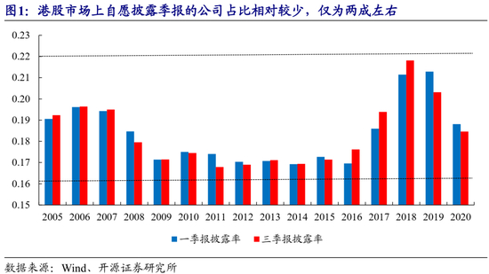 不再对季报做强制披露的要求在港股市场上早已实行多年,而美国证监会则对非美国公司的季报披露不做要求,对美国公司要求则相对更为严格。考虑到在美国证监会注册的非美公司来自世界各地,且存在大量多地上市的公司,同时受多地监管,因此很难分辨一家公司披露季报究竟是自愿性质,或是异地监管要求,因此我们选择将分析目光重点落在港股市场。