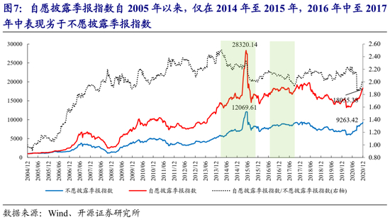 在面对两家基本面、估值与流动性基本一致的公司选择上,投资者似乎更愿意对信息披露更充分的公司给予溢价。接下来我们尝试在港股中通过设立自愿披露季报的股票组合与不披露季报的股票组合,按流通市值等权构建自愿披露季报指数与不愿披露季报指数,调仓日为每年的4月30日与10月31日。通过比较两者历史走势发现,自愿披露季报指数自2005年以来,仅在2014年至2015年,2016年中至2017年中表现劣于不愿披露季报指数,从这个角度来看,在其他条件相同时,投资者往往更加偏好披露季报的公司。