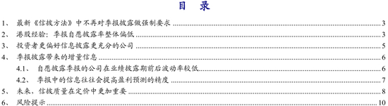 【报告导读】证监会将不再要求强制披露季报,而交易所制度尚未改变,如果未来这一要求放松,季报披露带来的平抑股价波动与校准盈利预期效应会使得投资者更偏向于自愿披露的公司,市场中将由于公司信批质量的不同而出现一种关注度和流动性的分化。