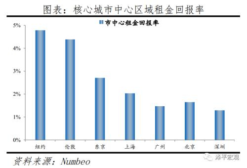 北上广深市中心租金回报率不足2.1%,低于纽约的4.8%、伦敦的3.3%、东京的2.7%。租金回报率是住房每年租金与售价的比值,租金回报率低意味着投资房地产的现金贴现率低。根据Numbeo2020年11月数据,在全球90个经济体327个城市中,市中心的静态租金回报率平均值为6.03%,中位值为5.07%,外围区的静态租金回报率平均值为7.21%,中位值为5.44%。其中,纽约市中心与外围区的租金回报率分别为4.78%、5.43%,伦敦为3.28%、4.38%,东京为2.70%、2.35%,而北京、上海、广州、深圳市中心租金回报率分别为1.64%、2.03%、1.46%、1.29%,外围区租金回报率分别为2.03%、2.11%、1.51%、1.38%。我们使用中国房地产协会旗下中国房价行情网数据进行验证,2019年北京、上海、广州、深圳全市范围的租金回报率分别为1.75%、1.98%、1.88%、1.54%。