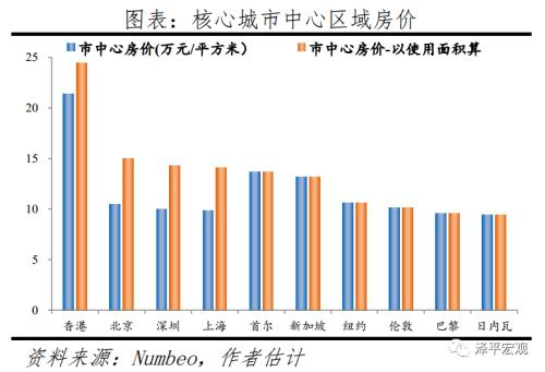 在中心区域,根据Numbeo2020年11月份城市中心区域房价数据,香港以214444元/平方米位居第一,纽约以105862元/平方米位居第四,伦敦以101570元/平方米位居第六,北京、深圳、上海分别以105088元/平方米、100077元/平方米、98706元/平方米位居全球第五、第七、第八,广州以54246元/平方米位居第二十九。换算为使用面积后,北京、深圳和上海中心区域实际房价分别为150126元/平方米、142968元/平方米和141008元/平方米,超过伦敦和纽约,仅次于香港,广州为77494元/平方米,未进前十。但是中国一线城市中心区的顶级豪宅单价低于国际大都市,比如纽约中心区最贵的豪宅是位于曼哈顿中城的公园大道432号,俯瞰纽约中央公园,单价约为77万元/平方米,而上海中心区最贵的豪宅是位于陆家嘴金融区紧邻黄浦江的汤臣一品,单价为25万元/平方米,以使用面积算,单价为36万元/平方米。