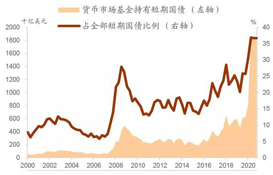 ► 货币市场基金主要投资短期国债,疫情以来持有短期国债比例进一步上升。2020年末,货币市场基金持有短期国债份额36.7%(图表17),远高于其持有全部国债比例9.2%。去年2季度联邦政府净发行短期国债2422亿美元,货币市场基金增持1056亿美元。下半年美国短期国债存量规模回落,货币市场基金持有量略有下降。(图表18)