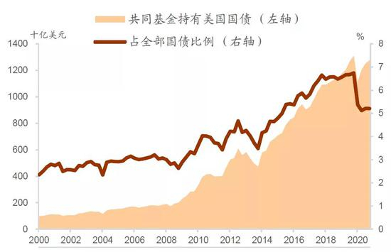 ► 共同基金疫情初期减持国债。金融危机以来,共同基金持有国债比例呈上升趋势。去年1季度共同基金持有国债规模减少1968亿美元,2季度开始回升。2020年底,共同基金持有1.28万亿美元国债,仍低于2019年1.31万亿美元(图表19)。当前共同基金持有美债规模和占比都低于趋势水平,存在上升空间。