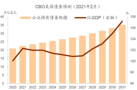 CBO预测2021年美国政府债务相对GDP比例进一步上升。根据美国国会预算办公室(CBO)2021年2月份预测,公众持有美国债务相对GDP比例将从2020年100.1%上升至2021年的102.3%,2022年开始回落,2026年降至100.9%低点之后再度回升(图表2)。