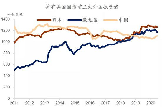 日本、欧元区和中国是美债前三大外国持有者。截至2021年2月,日本持有1.26万亿美元美国国债,欧元区持有1.17万亿美元美国国债,中国持有1.10万亿美元美国国债。过去10年,中国持有美国国债规模总体下降。2019年日本和欧元区超过中国成为美债第一和第二大外国持有者(图表10)。