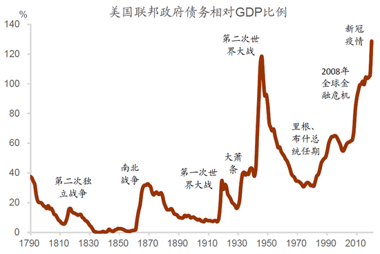 2020年遭受疫情冲击后,美国采取大规模财政刺激政策,联邦政府债务占GDP比例创历史新高。截至2021年2月末,美国政府债务总量约28万亿美元,同比增长19.6%。美国联邦政府债务相对GDP比例从2019年的108%上升至2020年的133%,超过二战后水平,创历史新高。历史上,美国政府债务率大幅增长有一半是因为战争;和平年代美国政府债务大幅上升主要有四次,分别是1929-1933年大萧条、1981-1993年里根和布什总统任期、2008年全球金融危机和2020年新冠疫情。(图表1)