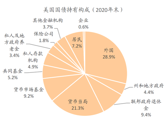 疫情以来,外国持有美国国债比例加速下滑,但仍是美国国债最大的投资者。2008年全球金融危机以来,外国购买美国国债减缓,外国持有美债比例2011年2季度达到43.4%的历史高点后开始下降。2020年新冠疫情爆发后,外国投资者持有美国国债比例加速下降,2020年末降至28.9%。(图表7)根据美联储资金流量表统计,截至2020年底,外国投资者持有美国国债余额28.9%,高于其他类别投资者持有份额(图表8)。