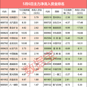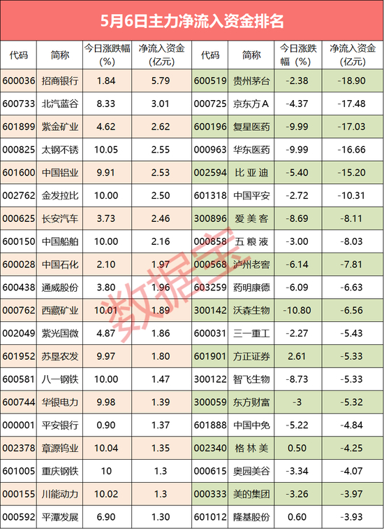 个股来看,共有30只个股主力资金净流入超亿元,招商银行主力资金净流入5.79亿元,净流入资金居首;北汽蓝谷、紫金矿业紧随其后,全天净流入资金分别为3.01亿元、2.62亿元;全天净流入资金较多的还有太钢不锈、中国铝业等。股价表现方面,净流入资金超亿元个股今日平均上涨6.07%,表现强于大盘,涨停的有重庆钢铁、太钢不锈、章源钨业等。跌幅较大的个股有东瑞股份、海尔智家、长江电力等,跌幅分别为9.98%、0.54%、0.40%。