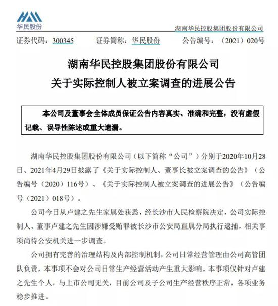 华民股份5月11日晚间发布了关于实际控制人被立案调查的进展公告。公告称,公司从卢建之先生家属处获悉,经长沙市人民检察院决定,公司实际控制人、董事卢建之先生因涉嫌受贿罪被长沙市公安局直属分局执行逮捕,相关事项尚待公安机关进一步调查。