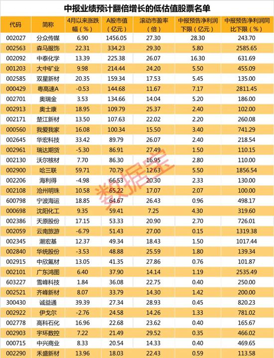 中报业绩翻倍增长的低估值股票来了(附名单)