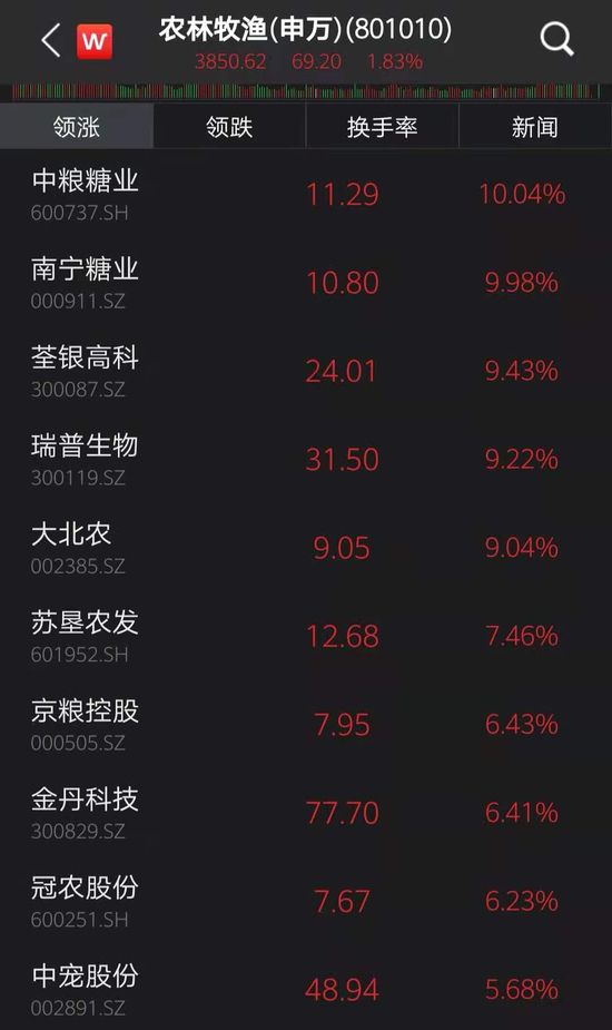 个股中,农业板块中,中粮糖业、南宁糖业涨停,荃银高科、瑞普生物、大北农涨超9%;
